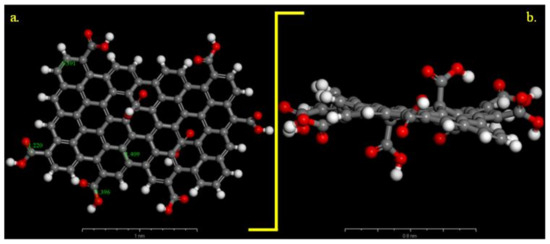 Optimized carboxylated graphene model (Universal forcefield): (a) on top view and (b) side view. Gray colour: C atoms, white colour: H atoms and red colour: O atoms.
