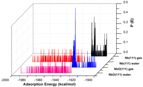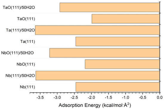 The adsorption energies presented from the MC simulations are summarized in Figure 5. This figure shows the distribution of potential energy as a function of adsorption energy, and the minimum adsorption is located on the left side of the axis. The adsorption energy for Nb (111) and Ta (111) surfaces divided per surface area of the used slab models is comparable for both the gas phase and in the presence of water molecules. The presence of water, as expected, favors the adsorption of GO-COOH, as it decreases the adsorption energy (the energy gain is around −1.8 kcal/mol·Å2).