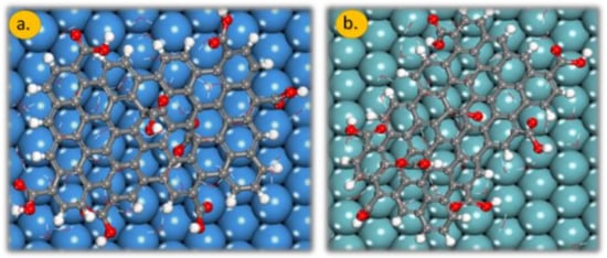Adsorption Locator module in Materials Studio 7.0 was used to build Nb (111), NbO (111), Ta (111) and TaO (111). The carboxylated graphene model (Figure 1) was built using Avogadro software (version no.1.0.1, Softonic, Barcelona, Spain) and was optimized using Universal force field (energy convergence tolerance of 2 × 10−5 kcal/mol, force convergence tolerance of 0.001 kcal/mol/A). The molecular dynamic simulations of the interaction between the GO-COOH studied as inhibitor and the surfaces were carried out in the simulation box with corresponding dimensions: [Nb (111)—28.00 Å × 28.00 Å × 5.47 Å; NbO (111)—28.32 Å × 26.79 Å × 6.31 Å; Ta (111)—28.02 Å × 28.02 Å × 4.67 Å; TaO (111)—31.26 Å × 31.26 Å × 6.63 Å using periodic boundary conditions with a of 20 Å vacuum along the C-axis. The solvent (water) effect was simulated by loading 50 water molecules (geometrically optimized using Universal forcefield) into the simulation box together with the studied molecules (using the same optimization algorithm). The Metropolis Monte Carlo method was used to evaluate the adsorption configurations (Universal, force field) of the interaction between the molecule and the substrates.