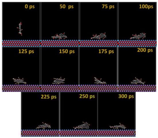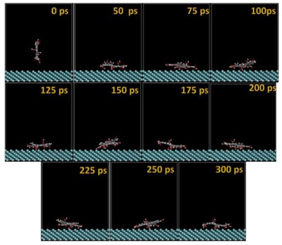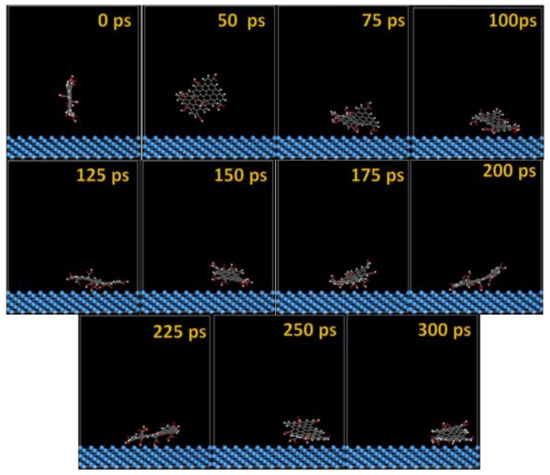 The GO-COOH rapidly reaches the surfaces; after 45 ps, it lies flat on the surfaces and tends to find the most favorable adsorption geometry that leads to the lowest energy of the systems.