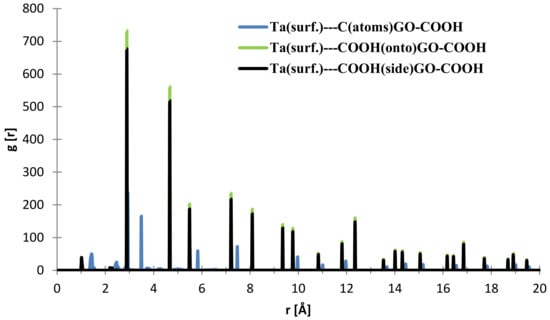 From Figure 9, the nearest distance distribution for most of the C (GO-COOH)–Ta (surface) atoms during the 300 ps MD simulation time has a very minor contribution at 1.03 Å, and a major one at the side –COOH group at 2.89 Å. Most of the atoms from the top COOH group during MS pass time at 2.88 Å; for the two COOH groups, there is a small RDF at a distance 2.86 Å that arises during the GO-COOH interaction with the surface in the interface vicinity.