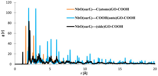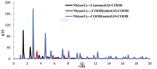 Regarding the interface distances in the case of NbO (111), as seen from Figure 14, the C (from GO-COOH) is positioned at 1.85–1.95 Å (two RDF peaks), the side-COOH group at 1.1 Å (important contribution) and the top COOH group fluctuates at 1.94 and 2.97 (meaning that the search for the most stable position has more complex dynamics than in the case of the Nb surface; this is also evidenced by the RDF spikes with decreased intensity from 20 to 4 Å).