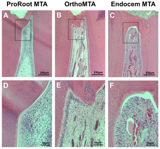 Hematoxylin-eosin staining for the evaluation of the histomorphologic characteristics of the newly formed calcific barrier (CB) after 8 weeks. Most PMTA and OMTA specimens formed continuous CBs and the pulps contained palisading patterns in the odontoblastic layer that were free from inflammation. However, EMTA specimens showed less favorable odontoblastic layer formation ((A–C): scale bars = 250 µm, (D–F): scale bars = 50 µm).