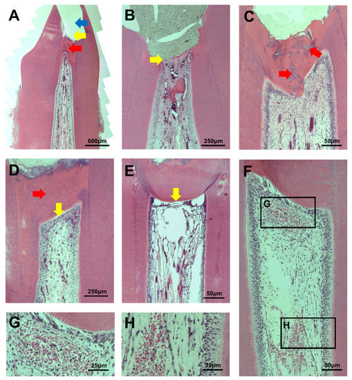 (A) An example of a pulpotomy procedure. The site of pulpotomy (yellow arrow) was an upper part of the calcific barrier (red arrow). MTA was filled in the pulp exposure area, but the material is not visible due to partial loss during specimen processing (blue arrow); (B) An EMTA specimen without a calcific barrier (yellow arrow). This corresponds to score 4 in the calcific barrier continuity category; (C) Moderate to severe tubule formation in calcific barrier of an OMTA specimen (red arrow); (D) A PMTA specimen with complete calcific barrier formation and no tubule in barrier (red arrow). It also has complete palisading cell pattern in odontoblastic cell layer (yellow arrow); (E) An EMTA specimen with absent odontoblastic cell layer under calcific barrier. This corresponds to score 4 in the odontoblastic cell layer category; (F–H) Inflammatory cells that are observed in coronal and middle pulps.