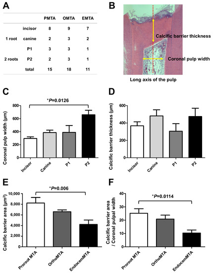 The area of the newly formed calcific barrier for each material after 8 weeks. (A) The distributions of tooth types among the three test groups; (B) An example measuring coronal pulpal width and calcific barrier thickness; Although the thickness of the calcific barriers did not vary according to tooth type (C); the width of the coronal pulp differed by tooth type (p = 0.0126) (D). Thus, the area of the calcific barrier was calculated by dividing by the horizontal width of the coronal pulp. The bars represent the mean ± the standard deviation; (E) In the PMTA group, the calcific barrier is widest, followed by those in the OMTA and EMTA groups. There is a statistically significant difference between the PMTA and EMTA groups (p = 0.006); (F) When the calcific barriers were standardized by coronal pulpal width, PMTA also had a significantly higher area than EMTA (p = 0.0114). We performed statistical analyses with a one-way ANOVA and the post hoc Scheffé test. The number of specimens is n = 15 in the PMTA group, n = 18 in the OMTA group, and n = 11 in the EMTA group.