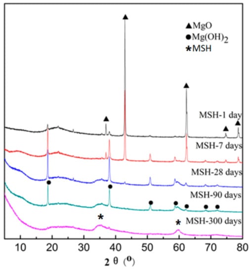 where αMgO is consumption percentage of MgO. wMgO (n days) represents residual MgO mass percentage (n is 1, 7, 28, 90 and 300) in MSH system and wMgO (0 day) represents initial MgO mass percentage in MSH system. The results are shown in Table 2.