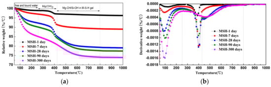 There are three weight loss stages that can be seen in Figure 2a. The first stage represents the weight loss of free and bound water (∆M1*) from room temperature to 250 °C. The free and bound water in reaction production increases with curing time. The water loss is related to the mass of MSH gels indirectly. According to the derivative weight curves (DTG) of MSH samples, the second mass loss can be observed in the 250–430 °C range, attributing to the de-hydroxylation of Mg(OH)2 (∆M2*). When heating temperature is over 430 °C, Mg–OH and Si–OH in MSH gels continue to remove the hydroxyl group. ∆M3* demonstrates the last weight loss stage and is consistent with the formation of MSH gel. The MSH gel content is normally obtained using the third thermo-gravimetric data.