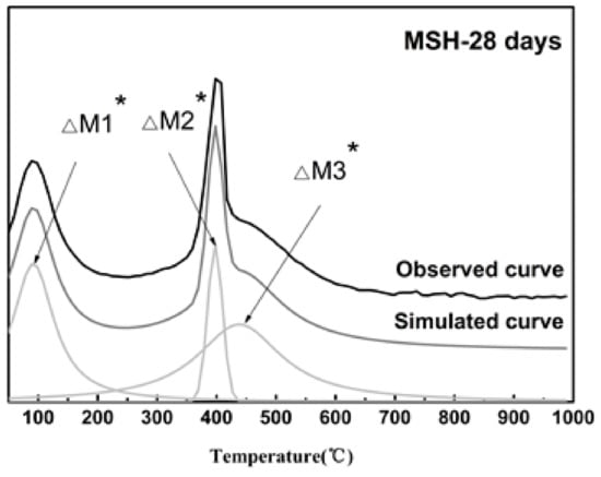 The corresponding TG/DTG data shows the relative weight loss and derivative weight curves of MSH samples at various ages, see Figure 2a,b. The reaction product is mixed with crystalline and amorphous phases. Attributing to overlapped weight loss peaks, the calculated value is lower than the actual value on the mass loss of MSH phase via traditional thermo-gravimetric analysis method. Based on the derivative thermo-gravimetric (TG/DTG) data, the integration area of derivative curves is equivalent to the weight loss. Therefore, the curve-fitting method based on the de-convolution technology can be used to analyze the DTG curves in order to obtain more precise calculation of each phase. Figure 3 demonstrates the analysis of MSH-28 days using curve-fitting method. Table 3 lists each Gaussian peak data of all the testing samples.