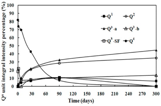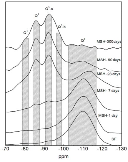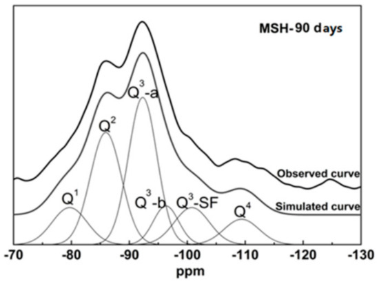The 29Si MAS NMR spectra of the SF sample show a peak at around −110 ppm, which is assigned to the Q4 unit, see Figure 4. This is consistent with a cross-linked framework formed from silicon-oxygen tetrahedron. Figure 4 also shows the spectra of MSH samples produced at different curing times. The peaks of MSH gel, found at −80, −85, −92, −97 and −110 ppm respectively, reveal the decomposition of SF and the formation of MSH gel in the MgO-SiO2-H2O system [46]. According to the literature, the features at −97, −92, −85 and −80 ppm correspond to Q3-b, Q3-a, Q2 and Q1, respectively [7,29]. In Figure 4, Q3 at −97 ppm disappears after 300 days curing. Chemical shifts located around −100 and −110 ppm are consistent with Q3-SF and Q4 environment (unreacted SF residue). Q3-a is assigned to the Si unit via inverted Si–O–Si linkages [29], while Q3-b likely reflects the Si unit in the Si–O tetrahedral layer. The 29Si MAS NMR spectra were de-convolved into different fitted curves based on the 29Si site data. Figure 5 illustrates the analysis of MSH-90 days using curve-fitting method. The data and calculation results from the de-convolution of 29Si NMR spectra are given in Table 4. The variation tendency of different Si–O tetrahedral environment is shown Figure 6.