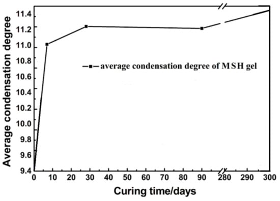 The CD results of MSH gels are shown in Figure 7. The average condensation degree rises quickly before 7 days and starts to level off (~0.8). After 90 days, the value slowly goes up to 0.84.