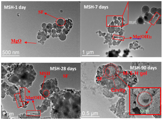 Transmission electron microscopy (TEM) bright field images of samples with different curing times. After 1 day, the spherical particles of the silica fume (SF) can still be found. As curing time extends, the particles gets covered and slowly consumed by MSH gel, forming the shell structure with cavity.