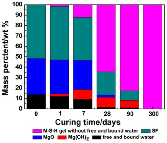 According to XRD, TG/DTG and 29Si NMR results, W(MSH gel) (the mass content of MSH gel) and W(free and bound water) (free and bound water) with different curing times can be calculated using Equations (8) and (9), as shown in Figure 10.