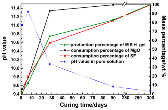 The hydrolysis of MgO affects the pH value of the solution directly. The pH value is increased to about 11.3 after 7 days curing and then decreased to 9 after 90 days, see Figure 11. According to the NMR and FT-IR results, SF dissolves quickly during the first 28 days, however, due to the drop of pH level (pH ≈ 9), the dissolution rate is then decreases as the curing time grows. MSH gel formed on the surface of SF particles and then the SF particles are gradually consumed by diffusion through the MSH shell. According to Figure 9, MSH gel grows on the surface of particles and towards the solution but not fill the gap between gel shell and particle, contributing to shell structure formation.