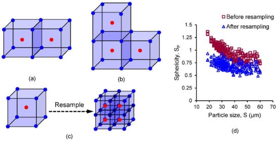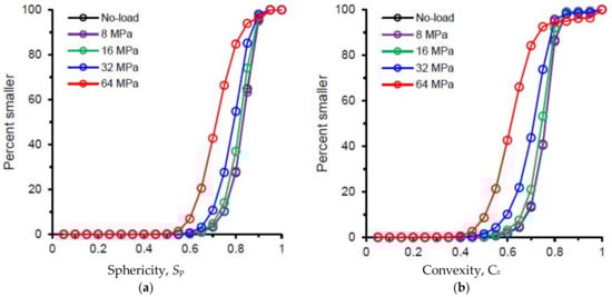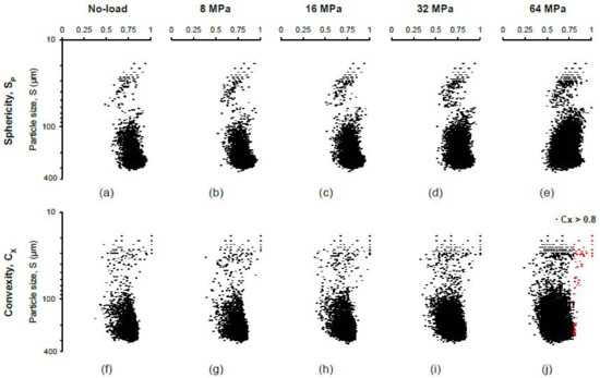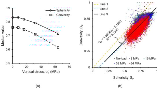 - The proposed resampling of image data for the smaller-sized particles, whose voxel centroids might lie on a single line or a plane, was found to produce meaningful sphericity values (≤1), which otherwise been ignored for morphological analysis. In general, the morphological parameters (sphericity and convexity) showed significant changes in the post-crushing stress-range due to the creation of smaller-sized particles of smaller sphericity and convexity values. The median values of the convexity and sphericity were observed to decrease with the increase of vertical stresses. This study found a linear relationship between the convexity and sphericity values.