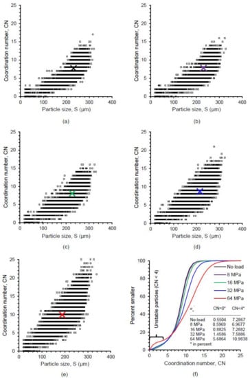 - The micromechanics of particle crushing was described by combining the variations of coordination number with particle size distributions at various stresses, where an increase of coordination number for particles ≥240 µm was observed due to the additional support provided by the newly created particles as a result of crushing. The crushing potential of particles was explained with the help of coordination number, particle size and position relative to loading piston.