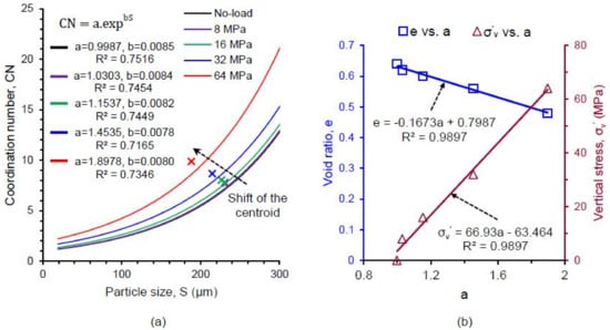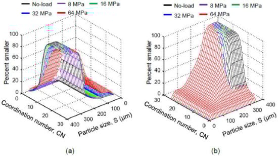 - A comprehensive algorithm for determining the coordination number, branch and contact normal vectors of particles was developed. This study found a dominant horizontally biased orientation of particles’ long-axes up to 32 MPa, thereafter a vertical bias appeared at 64 MPa as a result of many nearly vertical splitting of particles. In general, the coordination number was found to increase with the increase of particle size and applied stress. A good correlation between the void ratio and the average coordination number was observed.