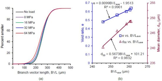 - The evolution of branch vectors under one-dimensional compression was found to be nearly isotropic with a gradual decrease of length in the post-crushing stress range (≥16 MPa). A strong correlation was evident between average branch vector length and void ratio, and mean diameter of particles. The contact normal vectors, on the other hand, showed significant horizontal and vertical biases at all stress levels investigated. Analysis of 1st kind-rank 2 fabric tensors showed a significant shift of the orientation of contact normal vectors from the horizontal at no-load to nearly vertical (i.e., formation of load columns) up to 32 MPa, thereafter again horizontal bias at 64 MPa.