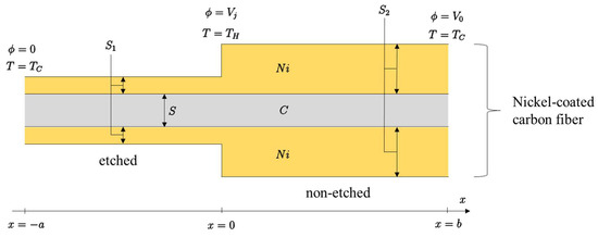 The following theoretical calculations are formulated according to the schematic diagram of NiCCY that has been shown in Figure 1 earlier. Generally, the temperature varies along the thermocouple wire: T(x). We know that T(−a) = T(b) = TC and T(0) = TH. Similarly, the electric potential depends on x. The generated voltage can be calculated as: