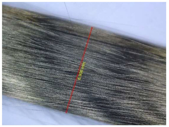An image of Tenax®-J HTS40 1420tex NiCCY provided by Toho Tenax Europe GmbH, Wuppertal, Germany. The image was taken with OneBird Smart 5M 300X USB Digital Microscope Camera Video with MicroCapture. The diameter of 6.906 mm was measured without any pretension [14].