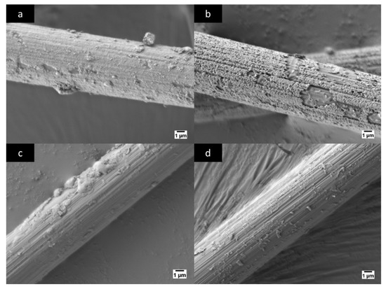 In Figure 4c, one may observe a further etch on the Ni layer due to an increased concentration of H2O2 from 3% up to 6%. Although the concentration of H2O2 is higher in the case of the treatment presented in Figure 4c, there are still some larger islands of Ni clearly visible. Nevertheless, a large zone of clean and grooved CF is also visible. In the case of the highest utilized concentration of H2O2 in this experiment, only some small dust, sparsely distributed, are present on the surface of CF (Figure 4d). Therefore, this confirms that the sample treated in 10% H2O2 + 37% HCl can be considered as a fully etched yarn.