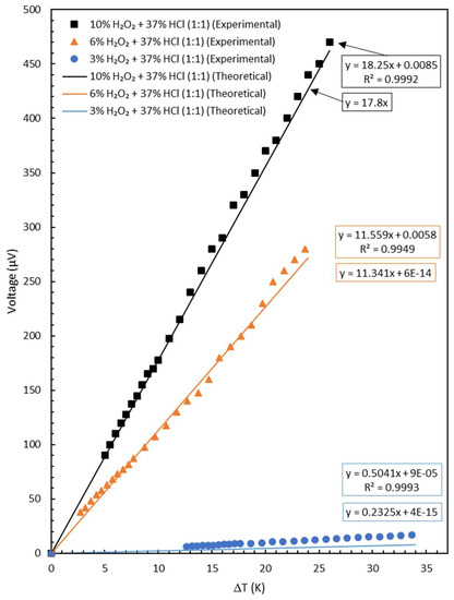 Values inside the boxes are linear trend line equations for the corresponding data of the 3–10% H2O2 with which each was mixed with 37% HCl in 1:1 ratio. The orange and blue boxes are attributed to the experimental and theoretical trend lines, respectively. The Seebeck coefficient values were taken from the slope of voltage vs. temperature difference.