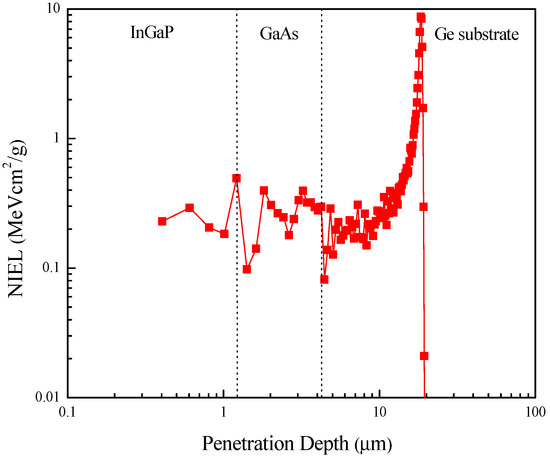 For the displacement-damage estimation, the non-ionizing energy loss (NIEL) gave the portion of energy lost due to displacement damage. The NIEL for the 5.1 MeV alpha particles in the InGaP/GaAs/Ge 3J solar cells was simulated by the Stopping and Range of Ions in Matter (SRIM) [13], and is shown in Figure 1. The displacement threshold energies used in the simulation were 10 eV for both Ga and As, 6.7 eV for In, 8.7 eV for P, and 27 eV for Ge [11]. In Figure 1, the Bragg damage peak of the 5.1 MeV alpha particles occurred at the end of the track at a depth of 11 µm, and was far away from the major active region of the three subcells. Thus, it was assumed that the distribution of displacement damage in the three subcells was uniform, and that the NIEL ≈ for the 5.1 MeV alpha particles.