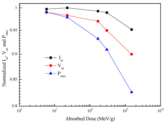 Normalized short-circuit current (Isc), open-circuit voltage (Voc), and the maximum power (Pmax) in the InGaP/GaAs/Ge triple-junction (3J) solar cells as a function of the absorbed dose.