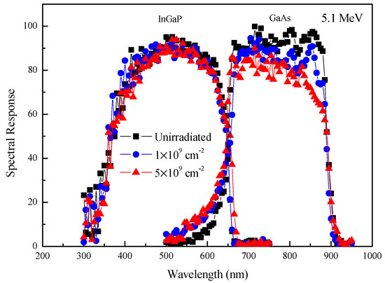 Figure 3 shows the changes in SR of the InGaP top cells and GaAs middle cells before and after 5.1 MeV alpha-particle irradiation with fluences of 1 × 109 cm−2 and 5 × 109 cm−2. The SR of the Ge bottom cells was not plotted in Figure 3 because the Ge subcells had a big-current and a small-voltage contribution to the InGaP/GaAs/Ge 3J solar cells [7]. In Figure 3, it can be noted that the SR dropped at wavelengths ranging from 650 nm to 900 nm for the GaAs middle cells after alpha-particle irradiation. However, the SR hardly decreased at wavelengths ranging from 350 nm to 650 nm for the InGaP top cells. This was mainly because there was lower migration energy of In (0.26 eV) and P (1.2 eV) in InGaP when compared with that of Ga (1.79 eV) and As (1.48 eV) in GaAs [14]. This meant that the GaAs middle cells were less radiation-resistant than the InGaP top cells. For InGaP/GaAs/Ge 3J solar cells, the photovoltage is the sum of the voltage for all three subcells, while the photocurrent is limited to the smallest value for any of the three subcells [15]. As a result, the degradation of the InGaP/GaAs/Ge solar cells was primarily controlled by the most radiation-sensitive subcell. Therefore, according to the SR measurements in Figure 3, the degradation of the InGaP/GaAs/Ge 3J solar cells was primarily controlled by the GaAs middle cells after alpha-particle irradiation.