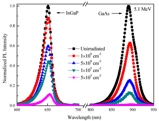 Figure 4 shows the changes in PL spectra of the InGaP top cells and GaAs middle cells at room temperature before and after 5.1 MeV alpha-particle irradiation with various fluences. As in Section 3.3, the PL spectra of the Ge bottom cells were not plotted in Figure 4. The PL intensity of the InGaP top cells and GaAs middle cells decreased with an increase in alpha-particle fluence, but the PL degradation of the GaAs middle cells was more than that of the InGaP top cells. This further corroborated that the GaAs middle cells were less radiation-resistant than the InGaP top cells.