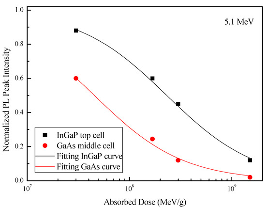 Figure 5 shows the changes in normalized PL peak intensity of the InGaP top cells and GaAs middle cells after alpha-particle irradiation with an absorbed dose ranging from 3 × 107 MeV/g to 1.5 × 109 MeV/g. The relationship between PL peak intensity and the absorbed dose can be expressed as [16]