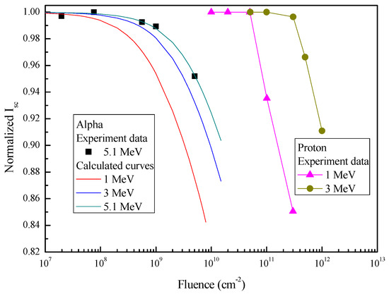 Degradation modeling of the InGaP/GaAs/Ge 3J solar cells under alpha-particle irradiation with various energies and fluences was performed using a theoretical method [17,18]. This approach was introduced in detail in our previous work [18]. In this method, we considered that the main reason for the degradation of the solar cells was the non-radiative recombination centers induced by alpha-particle irradiation in the active regions of the cells. Therefore, according to the value for the GaAs cells in Table 2, the degradation curves for Isc and Voc as a function of the fluence under 5.1 MeV alpha-particle irradiation were obtained, and are shown in Figure 6 and Figure 7, respectively. The degradation curves showed good agreement with experimental data. For modeling the degradation of solar cells under various alpha-particle energies, the values can be calculated by the following relationship [17]: