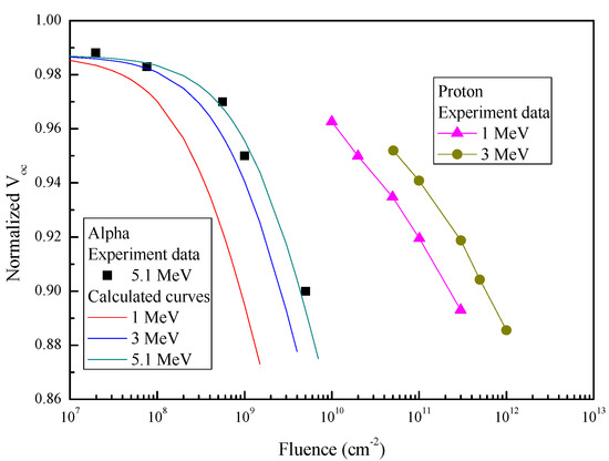 According to the values in Table 3, the degradations of Isc and Voc for 1 MeV and 3 MeV alpha-particle irradiation were predicted, and are shown in Figure 6 and Figure 7, respectively. Meanwhile, the degradation data of Isc and Voc for 1 MeV and 3 MeV proton irradiation are also shown in Figure 6 and Figure 7, respectively. As seen in both figures, the fluence of alpha-particle irradiation was about two orders of magnitude lower than that of proton irradiation for the same energy, when the degradation was identical. This was mainly because the introduction rate of defects for alpha particles is much larger than that for protons [20]. This meant that, although the relative abundance of alpha particles is lower than that of protons in the space environment, alpha particles cause a more serious degradation of space solar cells than that due to protons.