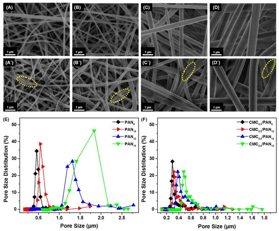 FE-SEM images of (A–D) electrospun PAN NFMs of different concentration 8, 10, 12 and 15 wt % respectively. (A′–D′) the corresponding NFMs coated with 0.5 wt % CMC respectively. Their corresponding pore size distribution curves before and after the coating shown in (E,F).