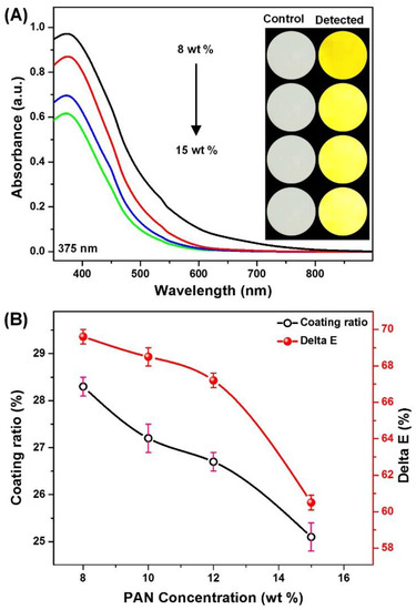 PAN NFMs were fabricated by applying the electrospun technique. Firstly, PAN was dried at 95 °C in vacuum for 2 h, then dissolved in DMF and stirred at room temperature for 24 h. The homogeneous solutions were electrospun using the optimized parameters of 1 mL/h flow rate, 20 kV applied voltage, a 15 cm working distance, and 19 G needle until the thickness of the PAN NFMs reached to around 70 μm. The electrospun chamber was kept at a constant temperature of 28 °C and relative humidity of 30%. The NFMs were dried in vacuum oven at 70 °C for 1 h. The concentrations of PAN were adjusted to 8, 10, 12, and 15 wt % (PAN8, PAN10, PAN12, and PAN15), to study the effect of PAN concentrations on colorimetric strips performance.