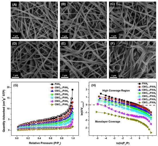 FE-SEM images of the PAN8 NFMs coated with various CMC concentrations of (A) 0.1; (B) 0.3; (C) 0.5; (D) 0.7; (E) 0.9; and (F) 1.1 wt %; (G) Nitrogen adsorption-desorption isotherms of the PAN8 NFMs and the corresponding coated NFMs (H) the corresponding FHH plot of ln(V/Vmono) against ln(ln(P0/P)) reconstructed from (G).