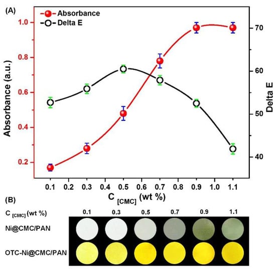 Posteriorly, the Ni0.1@CMCy/PAN8 NFMs with different CMC concentrations were exposed to 10 mM OTC for 30 min, and the absorbance was observed, as displayed in Figure 4A. It is apparent that the absorbance intensity gradually increased with the increase of CMC concentrations; when the coating percentage of CMC was 1.1 wt % (CMC1.1) the absorption intensity reached a maximum value. This may be ascribed to the increasing number of active sites for Ni2+ immobilization on the NFMs, thereby the OTC detection ability was theoretically improved. However, the calculated color difference values between the OTC-reacted and control samples indicated that CMC1.1 was not an optimum coating concentration. As shown in Figure 4B, PAN8 NFMs coating with CMC0.5 displayed the most significant color differences. Referring to the photograph of each sample shown in Figure 4B, it was found that the Ni2+ adsorption capacity of the NFMs coating with 1.1 wt % was higher than the others. Therefore, the color of 1.1 wt % coated NFMs displayed a deep green color, due to Ni2+ adsorbed on the surface of the NFMs resulting from low SSA (1.479 m2·g−1). The liquor waited for detection contained only tiny amounts of OTC, correspondingly causing color changes which were covered up by the background color (deep green). As a result, it was concluded that CMC0.5 is the optimum coating concentration for our detection. This is attributable to the relatively high SSA, which is 4.4 times higher than CMC1.1.