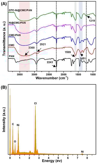 Generally, Ni2+ has a visual response to OTC in aqueous solution [31]. Additionally, since PAN NFMs cannot absorb Ni2+, a surface modification would be desired for Ni2+ immobilization. The incapable Ni2+ absorbing ability of PAN NFMs has been proven in Figure S4; the white color of PAN NFM was maintained after exposure in Ni2+ solution for 6 h. Subsequently, with the aim of endowing the PAN NFM with Ni2+ adsorption capacity, the NFMs were further functionalized with CMC. Evidence for the functionalization of the PAN NFM with CMC came from the FT-IR spectral analysis. As displayed in Figure 5A, characteristic peaks around 3360 cm−1, 2921 cm−1, and 1589 cm−1 in the spectrum of the CMC were assigned to the stretching vibration of -OH, CH, and COOH respectively. The peak around 2243 cm−1 in the spectrum of the PAN, belonged to the C≡N. It is worthwhile noting that all the peaks of the CMC/PAN NFM belonged to PAN and CMC, which indicates the successful coating of CMC on the PAN NFM. The success of the functionalization process is due to the strong hydrogen bond between aliphatic hydroxyl (C-OH) in CMC and the cyano group (C≡N) in PAN NFM [47,48,49]. These results suggest that the PAN NFM has been successfully modified with CMC and the hydroxyls are preserved. Because of the strong hydrogen bond, the CMC is formed within the PAN NFM, thus improving its stability and preventing it from leaking out of the PAN NFM.