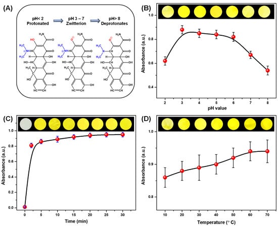 (A) The effect of the pH on the chemical structure of OTC. Optimization of OTC detection conditions: the maximum absorbance intensity with the change of (B) pH, (C) time, and (D) temperature; the corresponding optical images are shown as inserts.