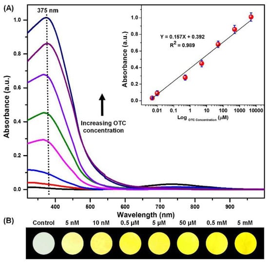 Subsequently, to increase the sensitivity for the detection of OTC, the kinetic sensing response was studied, since reaction time is an important parameter to be optimized in analytic assays. Ten millimolar OTC liquor was prepared, and the incubation times were set at intervals of 0, 2, 5, 10, 15, 20, 25, and 30 min. It can be seen clearly from Figure 6C that an obvious tendency of absorbance intensity at 375 nm showed a slight increase with increasing the incubation time. Even if the incubation time was prolonged, the observed results showed that the absorbance intensity at 375 nm had shown a small increase, and there seemed to be no visible color changes according to the digital photograph shown in Figure 6C.