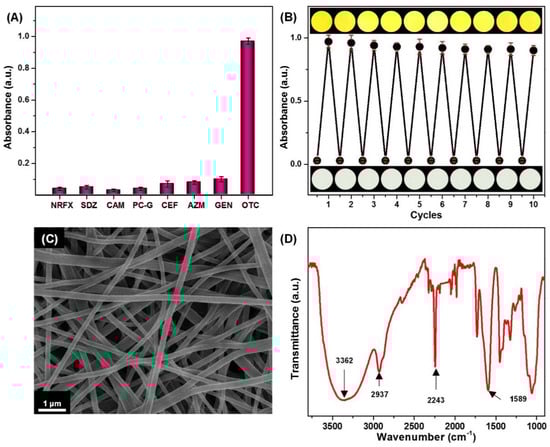 (A) The absorption intensity of the colorimetric strips indicating the selectivity after incubation for 20 min in the presence of OTC and various antibiotics at a concentration of 10 mM; (B) the absorbance intensity and optical colorimetric response, showing the reversibility of the colorimetric strips; (C) SEM image; and (D) FT-IR spectra of the colorimetric strips after 10 regeneration/reuse cycles.