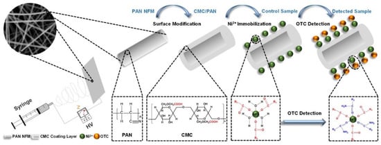 In the present study, colorimetric strips were developed for OTC detection based on composite NFMs; to the best of our knowledge no previous research has applied NFMs as a colorimetric platform to detect antibiotics. The designing protocol is illustrated in Scheme 1; firstly, Ni2+ was selected as a chromatic probe since it has the visual activity needed to complex with OTC through chemical coordination [31]. Secondly, the NFMs-based platform for Ni2+ immobilization was fabricated. Carboxymethylcellulose (CMC) is a crucial composite in the platform, with plenty of carboxymethyl groups in the molecular chain, which can serve as active sites for Ni2+ immobilization [32,33]. Unfortunately, the electrospinability of CMC is very poor. Thus, it cannot be fabricated directly into the platform [34]. On the other hand, electrospun polyacrylonitrile (PAN) NFMs presents good hydrophilicity, excellent chemical resistance, and great mechanical properties [35]. Therefore, PAN NFMs were selected as a support layer, then the platform of CMC/PAN was fabricated by modifying the surface of PAN NFMs with CMC. The optimum PAN, CMC, and Ni2+ concentrations were determined to yield the maximum color difference (ΔE) between the control sample and detected sample. Moreover, the colorimetric strips give a visible change in color from light-green to yellow based on the fact that immobilized Ni2+ can capture OTC in solution and form a Ni–OTC complex. Due to the strong-complex behavior between the colorimetric strips and OTC, the large SSA as well as the small pore size of the NFMs, the colorimetric strips showed a rapid response, high sensitivity, good selectivity, and is promising for real-work applications to detect OTC.