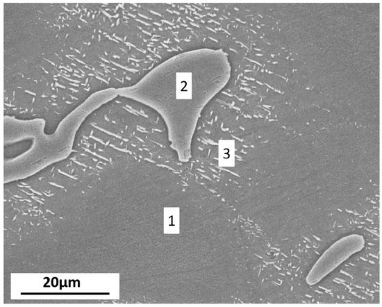 In Figure 1, the microstructure of AZ91D alloy is presented. It shows that AZ91D is a two-phase alloy, consisting of α-matrix (marked (1) in Figure 1) and β-phase (marked (2) in Figure 1). The fine lamellar (α + β) micro-constituents are marked (3) in Figure 1, with white regions representing β-phase. The large β articles are interconnected and form a fine network throughout the microstructure. Further, the element composition of regions 1 and 2 measured by EDX is presented in Table 2.
