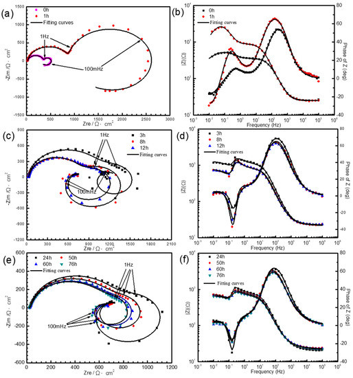 After immersion in simulated HA solution for various times up to 76 h, Nyquist and Bode diagrams of AZ91D sample are depicted in Figure 3, exhibiting various electrochemical characteristics.