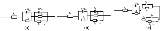 Equivalent circuits for AZ91D with different exposure time in simulated HA solution: (a) Model A, (b) Model B, (c) Model C.