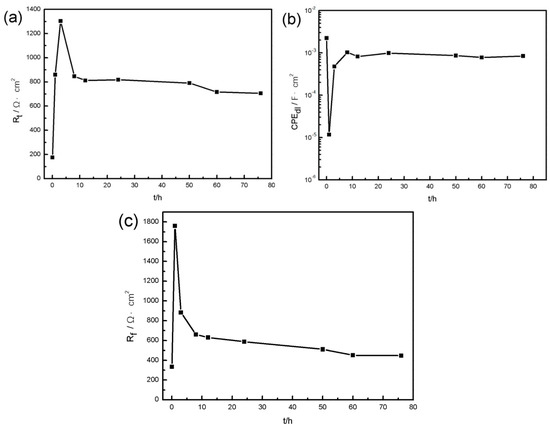 Fitting results of resistances and constant phase element during the immersion test: (a) charge transfer resistance Rt, (b) constant phase element CPEdl, (c) film resistance Rf.