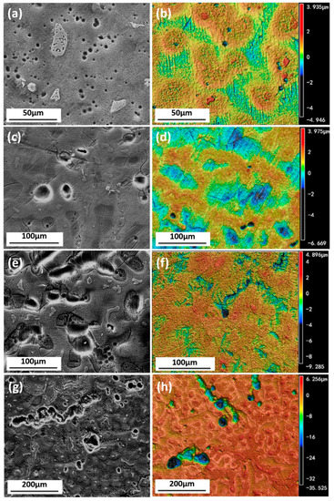 Figure 11 shows the surface morphology of tested samples after rust removal. Figure 11a shows that overall corrosion and localized corrosion develop on the surface when immersed in simulated HA solution. In the absence of , less serious localized corrosion pits are formed on the surface, as Figure 11b shows. The morphology in Figure 11c reveals the terrible corroded surface resulting from the lack of , and the corrosion pits are distributed around the resistant β-phase network, suggesting that holds back the corrosion process as it does for some other metals [33]. The slight pitting corrosion shown in Figure 11d discloses that the absence of slows down the corrosion process drastically. The shortage of Cl− alleviates the pitting corrosion of AZ91D (Figure 11e), indicating that Cl− helps to develop localized corrosion. The pre-study shows that Cl− promotes rapid attack in neutral aqueous solutions and acidic solutions [34,35].