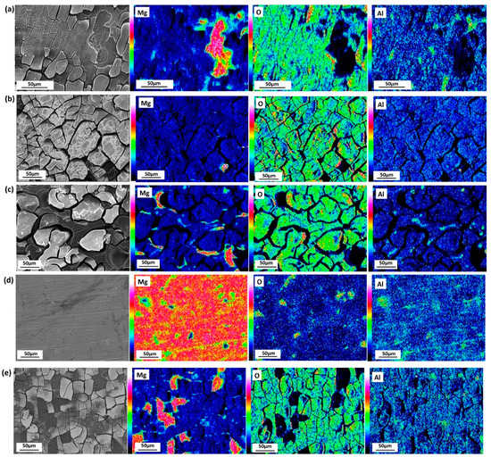 The SEM micrographs and corresponding EDX maps of the surface of the tested samples are shown in Figure 10. After 11 days immersion, the product film ruptures terribly, even slips off the bulk, and the bare Mg matrix is exposed, as shown in Figure 10a. As Figure 10b discloses, when lacking , the film is broken evenly, but barely comes off the matrix. As can be seen from Figure 10c, when is absent, localized corrosion is severe, Al enrichment is found in the remaining bulk. Figure 10d shows that the surface of sample is damaged slightly when short of . As Figure 10e reveals, Cl− does not show much influence towards corrosion, because the surface appearance is like that shown in Figure 10a.