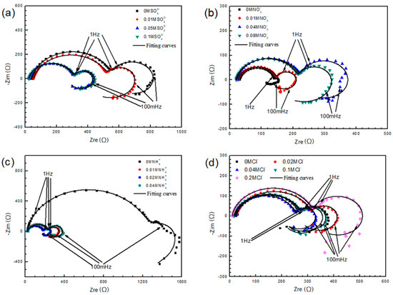 Figure 12 shows the Nyquist diagrams of AZ91D samples immersed in solutions containing different concentrations of water-soluble ions, exhibiting various electrochemical characteristics. The equivalent circuit is Model A in Figure 4a. The shape of the complex diagram changes with ions concentration and displays how the ions influenced the corrosion process. Figure 12a indicates that is harmful to AZ91D, but the impedance arcs reach a stable state once the concentration of exceeds a certain value. Figure 12b reveals that is a kind of protective ions, as the impedance modulus value tends to grow large with the increasing concentration. Figure 12c shows that is the most significant ion in this study, for the impedance modulus value decreases by more than four times with only 0.01M . Figure 12d suggests that Cl− does not show evident influence. Therefore, and are the two most obvious ions among the four kinds of water-soluble ions.
