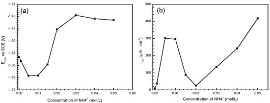 In order to obtain further information about the influence of ions, electrochemical measurements were carried out. The original composition of simulated HA solution is mentioned in Section 2.1. When it comes to the influence , the concentration of is adjusted from 0.05 to 0, 0.01, 0.05, 0.1 M, respectively. This is consistent with the rest of the three ions.