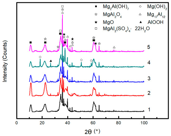After the immersion test, the corrosion product slipping off was collected and powdered to be analyzed through XRD. As shown in Figure 15, MgO and MgAl2O4 are the main corrosion products. As shown in No.2 XRD pattern, the absence of results in an evidently lower MgAl2(SO4)4·22H2O peak, indicating that MgAl2(SO4)4·22H2O is also an important product. It reveals from the No.4 XRD pattern that the product collected in solution lack of contained Mg(OH)2, which barely exists in other results, identifying accelerates corrosion by consuming OH− in a straightforward way.
